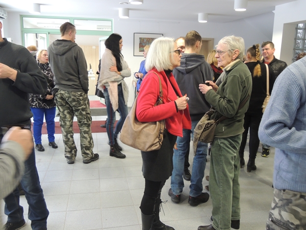 Po części oficjalnej głos należał już do samej artystki. Pani Barbara opowiedziała o swoich pracach, informując z jakiego okresu działalności twórczej pochodzą, jednocześnie dzieląc je na dwa rodzaje – linoryty i litografia, która stanowi główny obszar działań w ramach doktoratu artystki, oraz ilustracje.