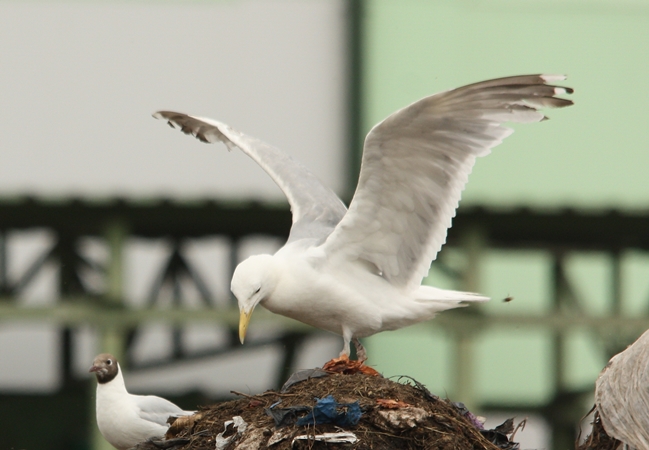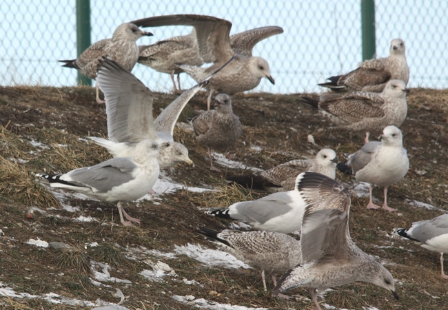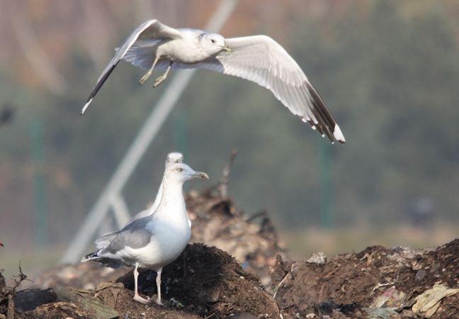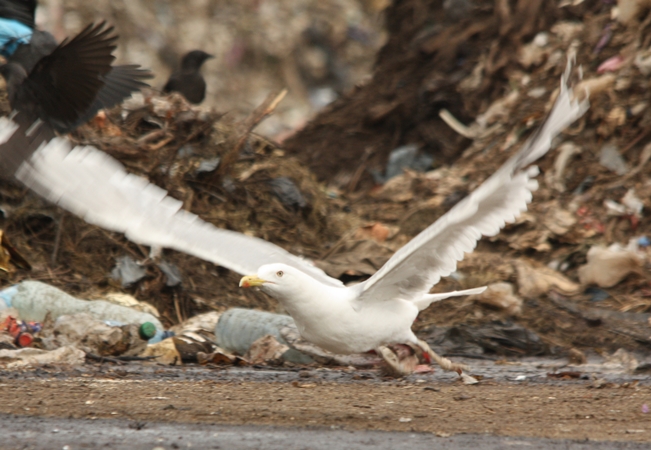 Zawsze trochę dziwiło mnie, że mewy srebrzyste nie do końca wykorzystują swoje warunki i możliwości. Taki dziób, takie skrzydła, takie gabaryty - to powinna być prawdziwa potęga, postrach okolic. W końcu to ptak mniej więcej pokroju myszołowa. Tymczasem w pewnych sytuacjach bardzo często są zadziwiająco pasywne. Świadectwo takiej postawy obserwuje wielokrotnie na składowisku w Zakładzie Unieszkodliwiania Odpadów Komunalnych w Spytkowie. Wysypiska, bądź składowiska odpadów to dla wszystkich mew miejsca bardzo istotne i poszukiwane. Również mewy srebrzyste są doskonale przystosowane i predysponowane do żerowania wśród resztek i odpadów. Niemal przez cały rok na terenie zakładu przebywają mniejsze lub większe stada tych ptaków. W okresach jesiennych i wiosennych przelotów liczebność "srebrzaków" znacznie się zwiększa. Czasami są to nawet zbiorowiska liczące ok. 500 ptaków. Mewy srebrzyste ze środkowej i północnej Europy to ptaki migrujące, te z zachodniej części kontynentu prowadzą osiadły tryb życia. Wysypiska śmieci to doskonałe miejsce dla szukających posiłku i odpoczynku przelotnych osobników. Jest więc duży ruch w całym interesie, przez niewielki teren zakładu w ciągu całego roku przewijają się całe masy tych ptaków.